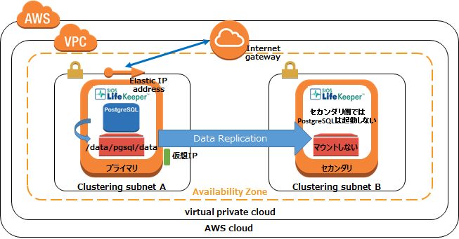 “/data”配下はLifeKeeperのData Replication機能を利用した共有ファイルシステムとなっており、LifeKeeperがPostgreSQLのプロセスおよび、データベース保存領域を管理します。